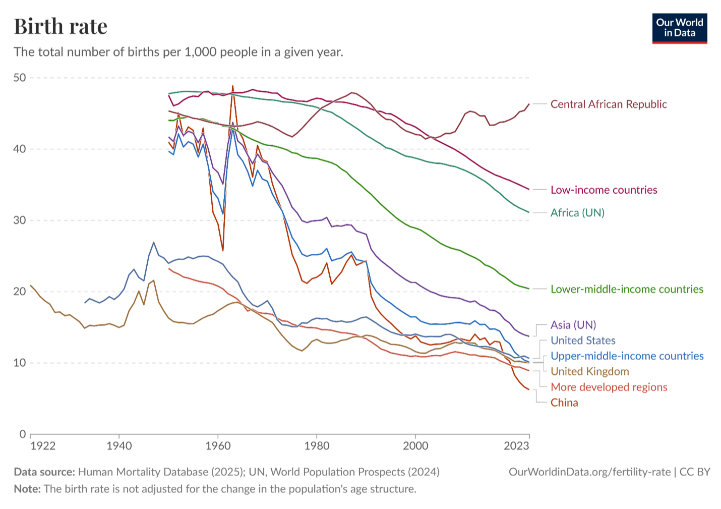 - Our World in Data – historical and current birth rates, population growth rates, and global demographic visualizations